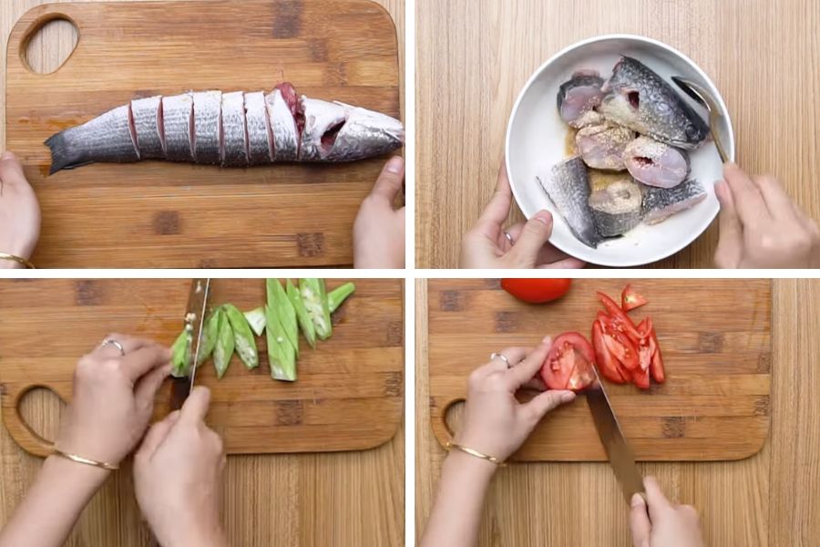 - Cá lóc mua về làm sạch, đánh vảy, bỏ ruột rồi cắt khúc vừa ăn. Ướp cá với 1/2 muỗng canh hạt nêm, 1/2 muỗng canh tiêu rồi trộn đều, để trong khoảng 15 phút.