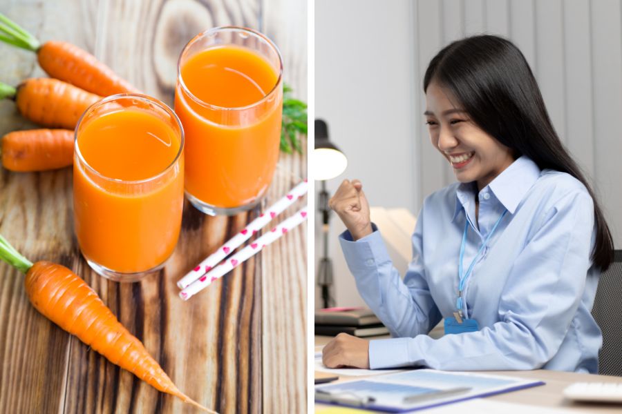 Trong nước ép chế biến từ cà rốt có chứa nhiều chất chống oxy hóa như beta-caroten, vitamin C, E. Những dưỡng chất này có khả năng giúp giảm tổn thương từ các gốc tự do khi cơ thể căng thẳng. Ngoài ra, trong cà rốt cũng có chứa magie, vitamin B giúp thúc đẩy sự thư giãn cơ, cải thiện tâm trạng.