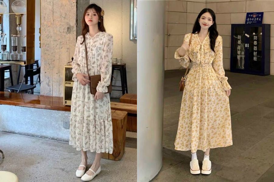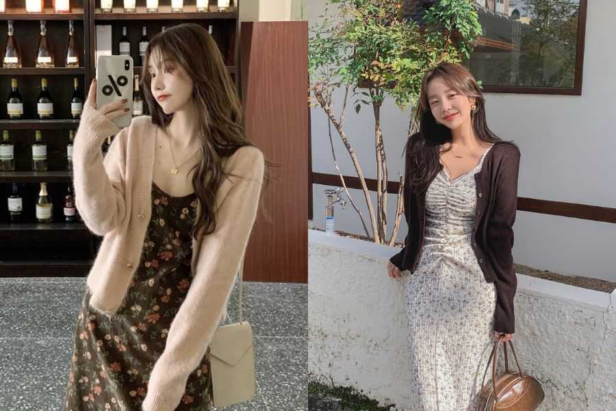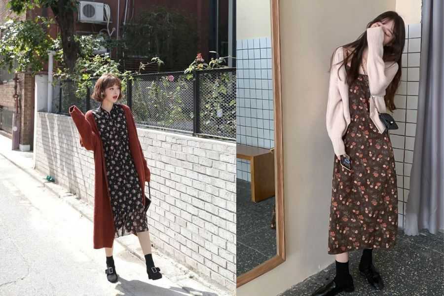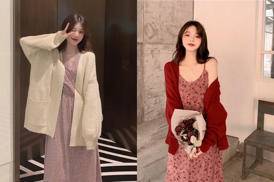 Thêm cho bạn 1 outfit phối đồ đi chơi noel nữ tính, dịu dàng đó là chiếc áo cardigan dáng dài kết hợp cùng váy hoa vintage. Bạn có thể lựa chọn váy hoa dáng dài hoặc ngắn đều xinh. Đừng quên cân nhắc phối màu sao cho nổi bật và thật hài hòa nhé!