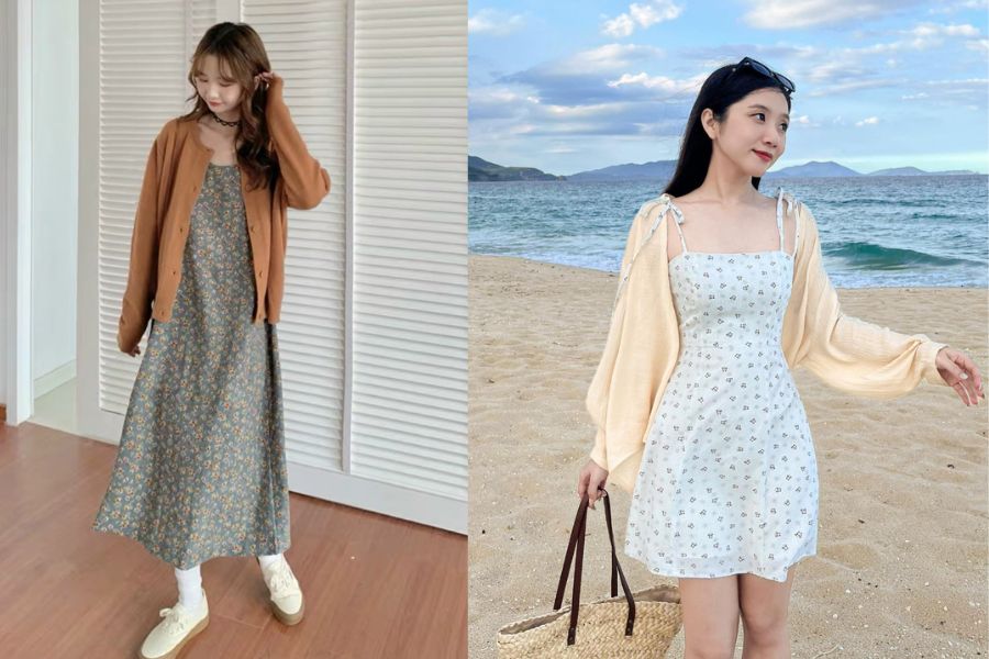 Áo cardigan dáng dài với váy hoa