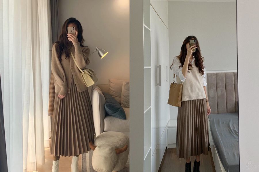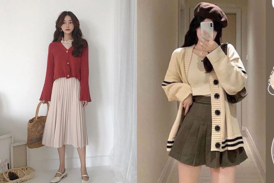 Áo cardigan và chân váy xếp ly