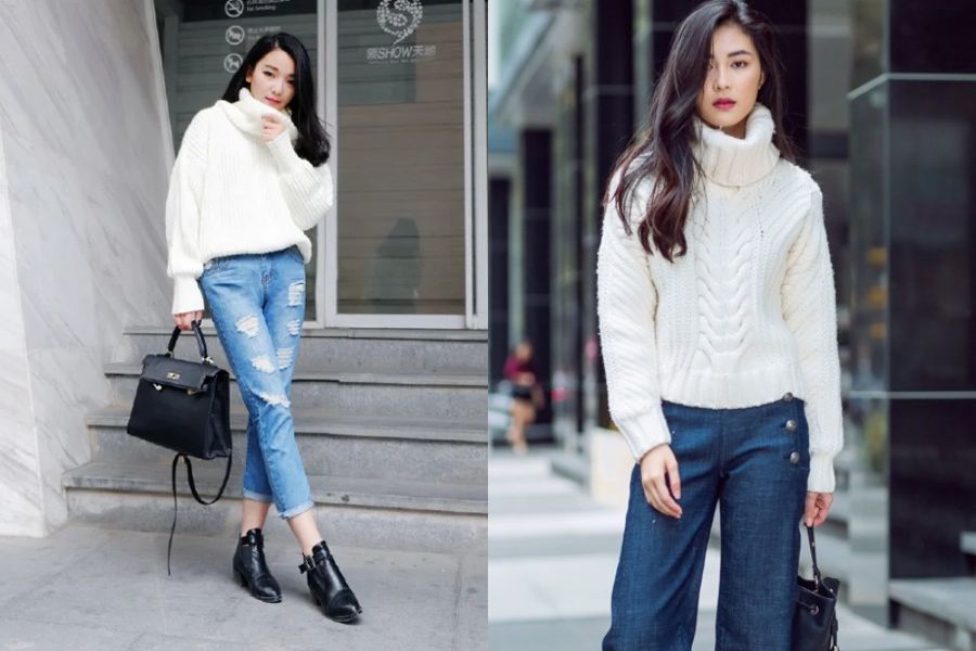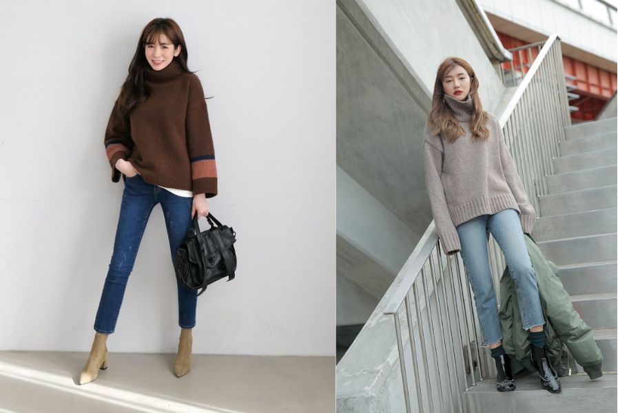 Áo len cổ lọ và quần jeans