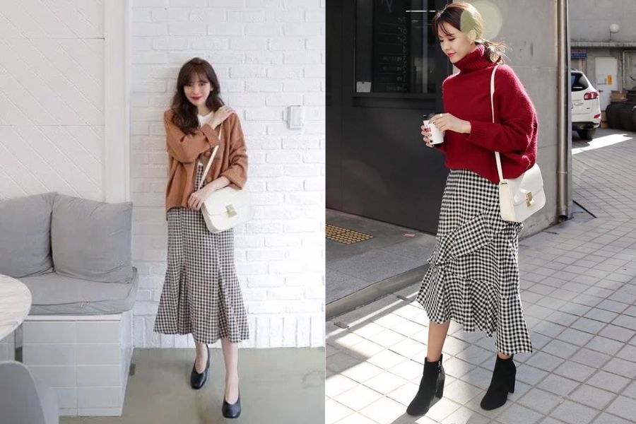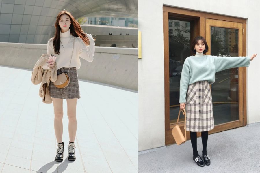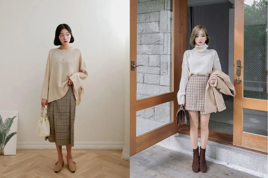 Áo len suông và chân váy caro
