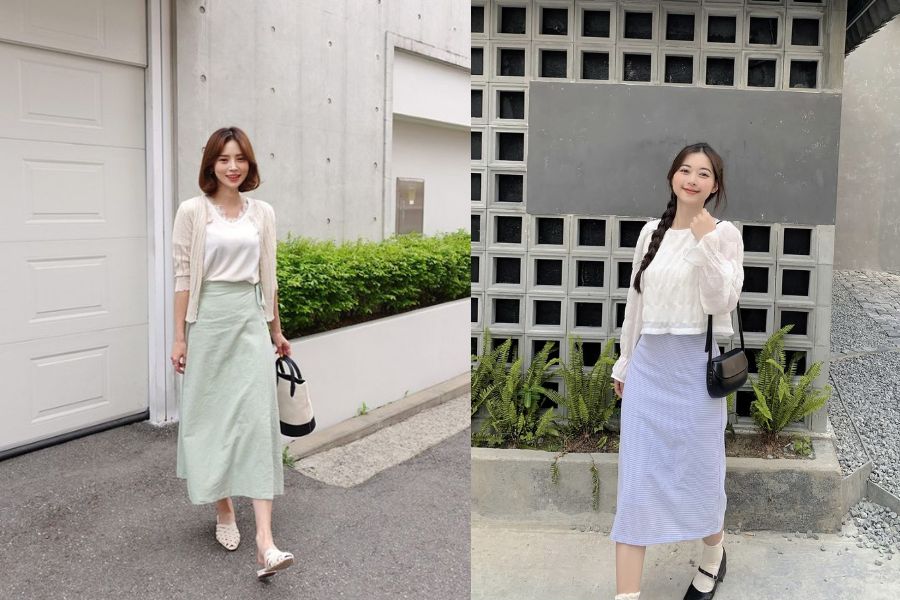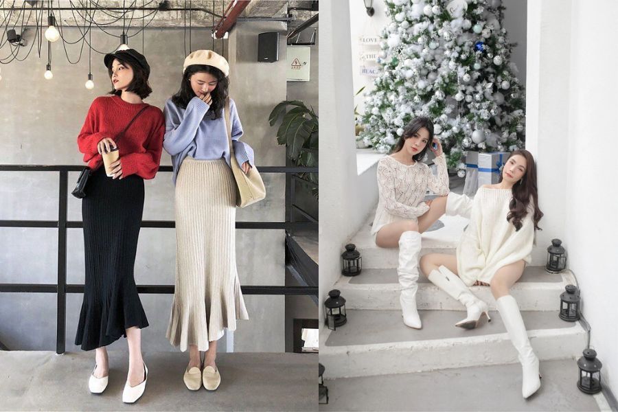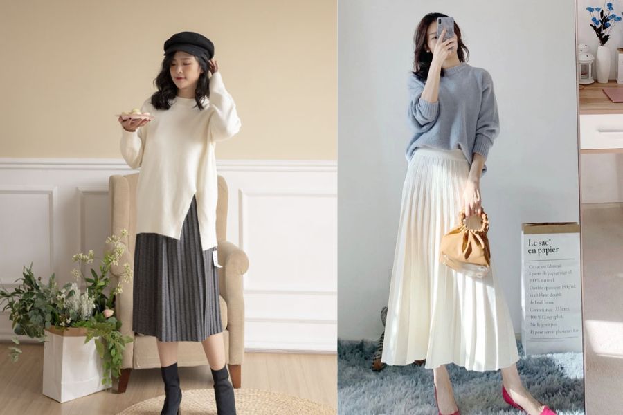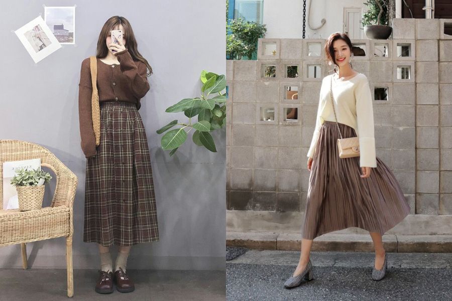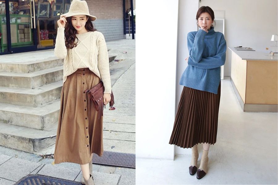 Áo len và chân váy midi