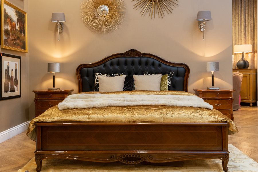 - Giường ngủ: Là một trong những sản phẩm nội thất quan trọng và được đầu tư kỹ lưỡng nhất. Được thiết kế với các chất liệu đắt tiền và có kiểu dáng độc đáo, đầu giường được trang trí bằng gỗ quý hoặc kim loại quý.