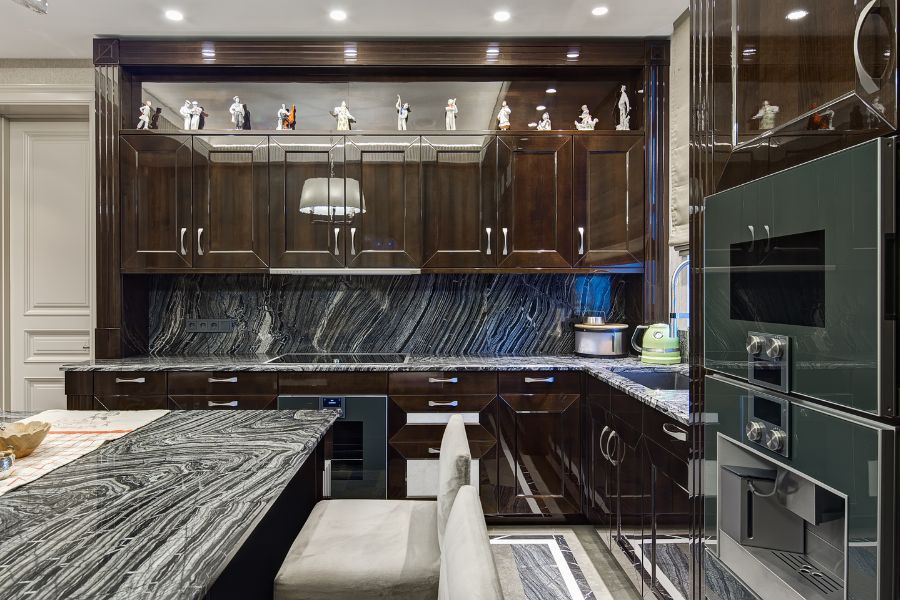 - Bàn ăn: Được làm bằng những chất liệu cao cấp như đá hoa cương, gỗ quý, kim loại quý, mặt bàn được trang trí bằng những đường nét tinh tế và độc đáo. Ghế ăn thường được làm bằng da thật hoặc vải cao cấp tạo nên một phòng bếp xa hoa, lộng lẫy.