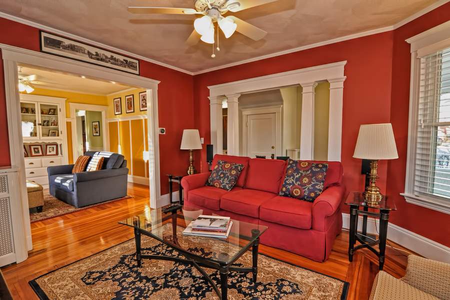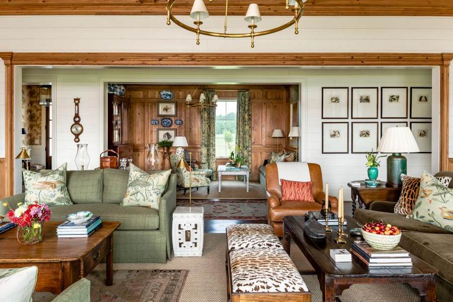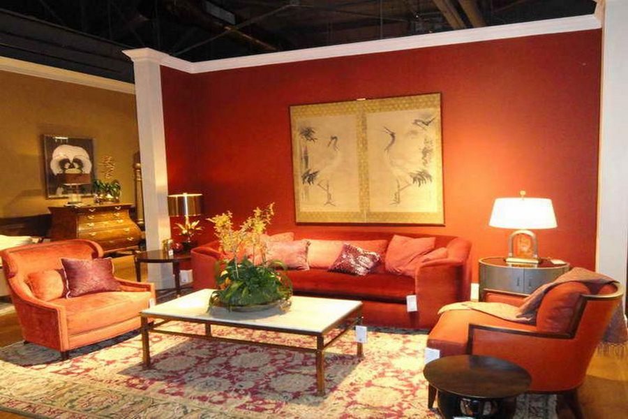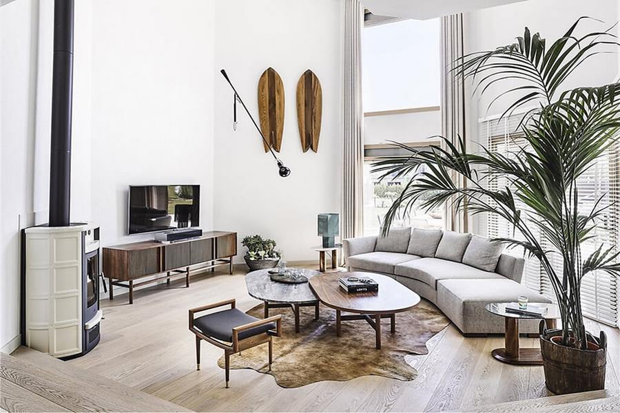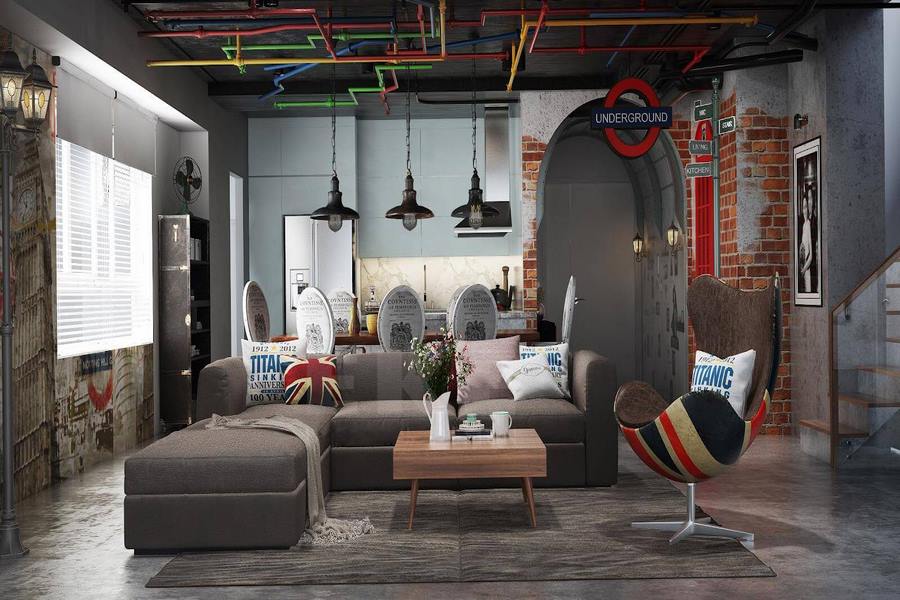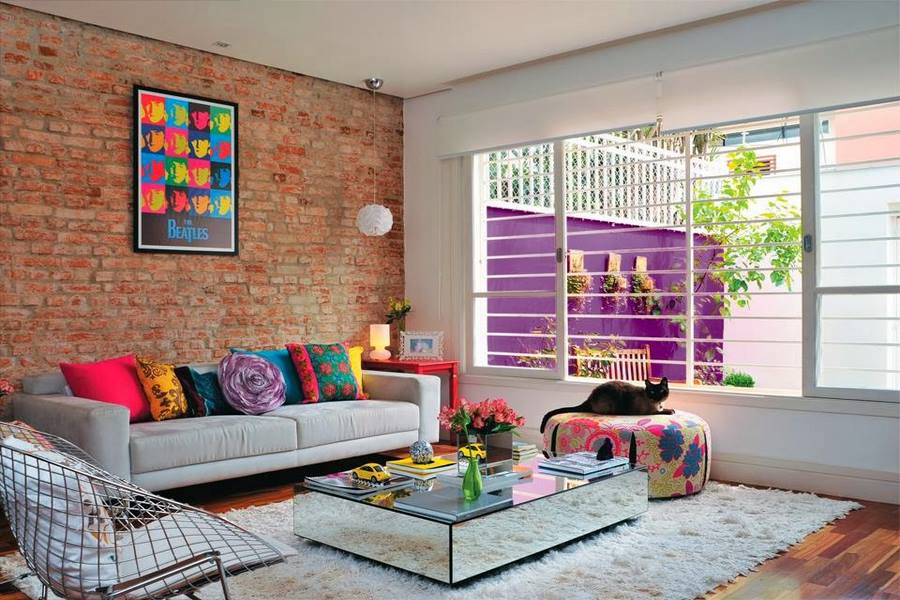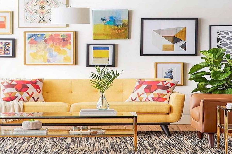 Bộ sofa được đặt ở trung tâm có tác dụng như vật trang trí chủ đạo của căn phòng khách. Nội thất chủ đạo của thiết kế này thường có màu sắc rực rỡ như xanh, vàng, đỏ đun… với họa tiết rực rỡ cuốn hút mắt người nhìn. Tường được trang trí bằng màu sắc khá nhẹ nhàng để làm nổi bật các nội thất.