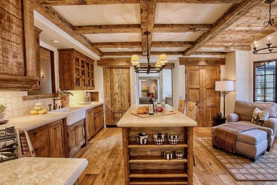 Ngoài đá tự nhiên, đá nhân tạo gốc thạch anh cũng có thể được sử dụng để đặt trong các không gian chính. Đặc biệt là những thanh xà gỗ lộ ra trên trần vô cùng khỏe khoắn và độc đáo. Do đó, nếu không sử dụng gỗ và đá, thiết kế này sẽ không phải là thiết kế theo Rustic Style nữa.