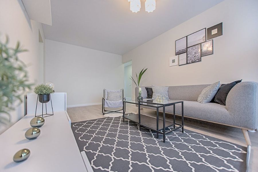 Bạn nên sắp xếp đồ nội thất một cách hợp lý để tạo ra một không gian phòng khách hài hòa nhất. Ví dụ, một tấm thảm mềm, mịn kết hợp với một chiếc đèn đứng đơn giản cũng có thể là một ý tưởng trang trí tuyệt vời cho phòng khách.