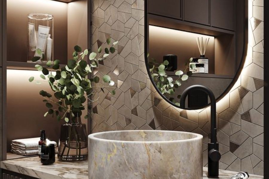 Các đường thiết kế thẳng mang lại cảm giác tối giản nhưng hiện đại. Hầu hết vật liệu ốp tường là sự kết hợp hài hòa giữa gỗ công nghiệp và đá, vừa ấm áp mộc mạc, vừa hiện đại, trang trọng.