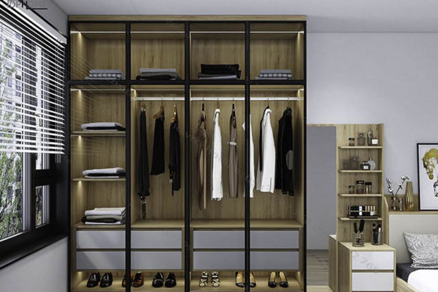 Tủ quần áo: Kích thước của tủ cần phù hợp với không gian của căn phòng, và hình dáng cần phù hợp nhất với giường ngủ. Để tạo nên một không gian hoàn hảo cần kết hợp hài hòa giữa tính tiện ích và tính thẩm mỹ.