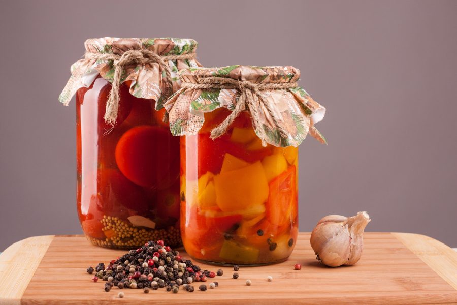 - Xếp cà chua, rau củ và hành tím vào hũ, rồi đổ hỗn hợp phía trên vào