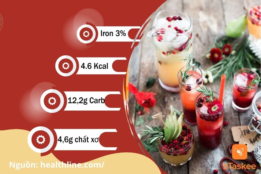 Trong 100g nam việt quất sẽ chứa khoảng 46 Kcal; 4,6g chất xơ, 12,2g Carbohydrate; và vô số khoáng chất khác như Folates, các chất điện giải, vitamin A, B1, B6, C, E