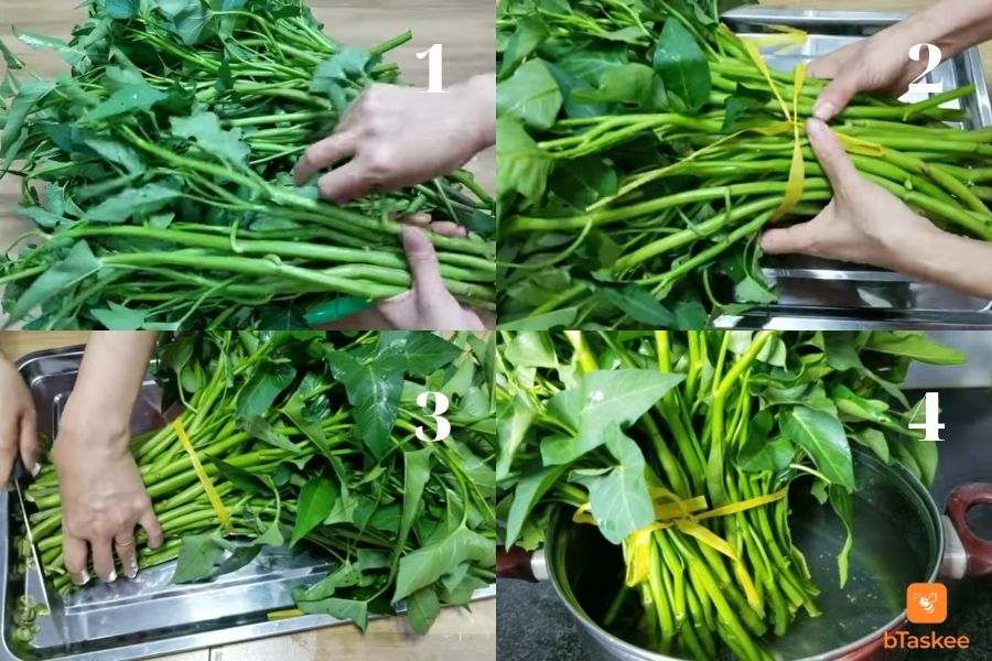 Bạn hãy lặt bỏ phần lá ở gốc rau muống. Sau đó buộc rau thành từng bó để rau đứng vững khi cắm, không buộc bó rau quá chặt. Dùng dao cắt bỏ phần gốc từ 1-2cm để các gốc trong bó được đều nhau.