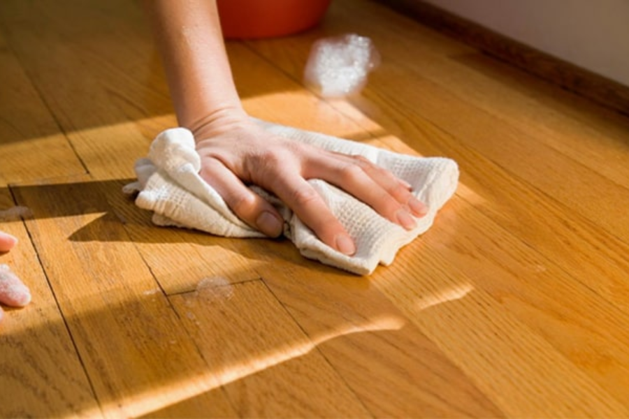 Bước 1: Dùng vải mềm có khả năng thấm nước để lau sạch phần nước đang đọng trên bề mặt sàn. Nên lau sàn thật khô để phòng ngừa trường hợp nước ngấm xuống lớp cốt sàn nằm bên dưới.