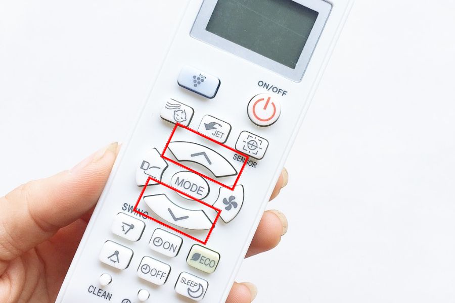 Bước 2: Đưa remote hướng về phía mắt nhận tín hiệu trên dàn lạnh. Bấm và giữ phím “SET” trong khoảng 3 – 5 giây cho đến khi màn hình điều khiển có 3 vạch nhấp nháy (- – -) hoặc hiện lên mã số.