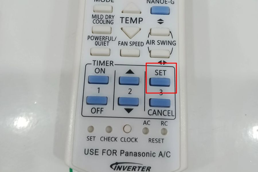 Bước 2: Nhấn và giữ phím “SET” trong khoảng 5 – 6 giây cho đến khi mã tần số trên điều hòa nhấp nháy.