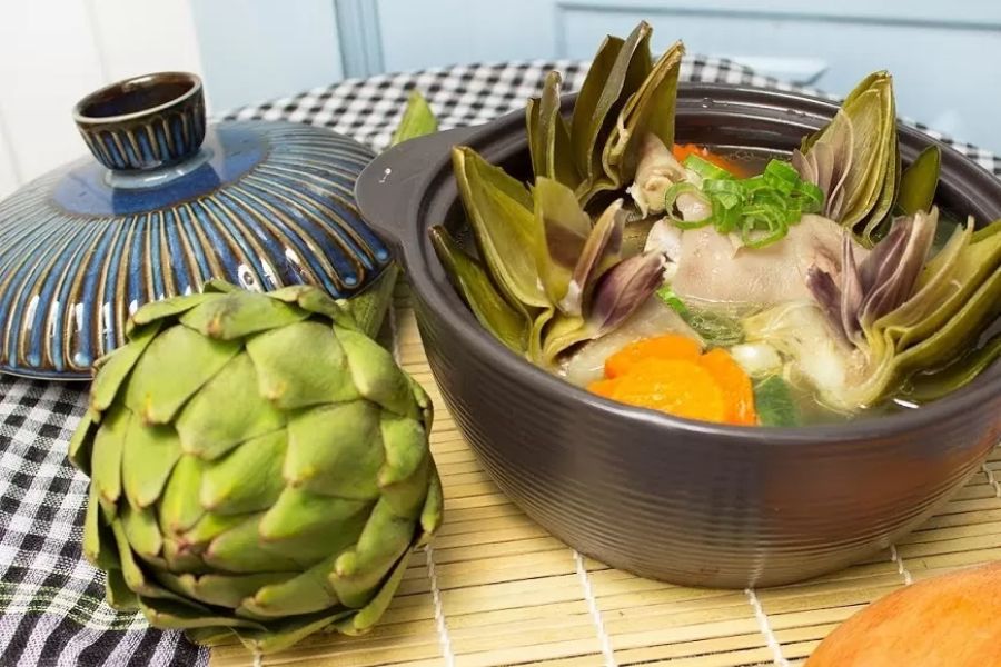 Canh atiso thực chất là món ăn thanh đạm vì nó giàu chất xơ, bổ dưỡng và đem lại khá nhiều lợi ích cho sức khỏe. Nói chi tiết hơn thì canh atiso giúp thanh lọc gan, giảm cholesterol xấu, tăng hệ miễn dịch và đồng thời hỗ trợ quá trình giảm cân. Vì thế, canh atiso là món ăn tuyệt vời giúp bạn “lọc” bớt những chất dầu mỡ từ các món chiên xào và thay thế những món giàu chất đạm trong những ngày Tết đó.