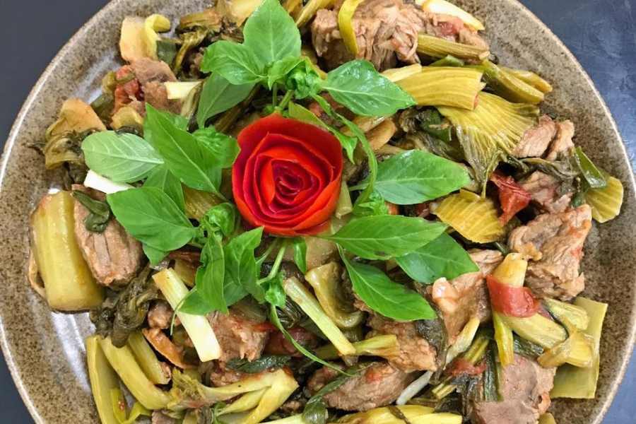 Thăn bò cắt thành miếng nhỏ, ướp gia vị cho thấm rồi cho lên bếp kho cùng với dưa muối chua. Khi thịt bò chín mềm và nước kho cạn dần là có thể tắt bếp để thưởng thức.