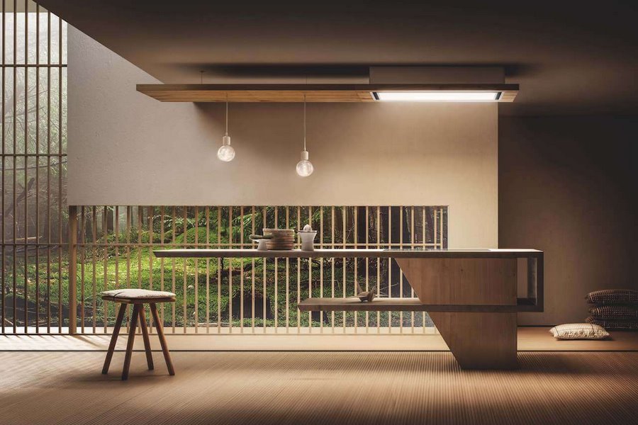 Tổng thể không gian của khu vực bếp sử dụng tông màu nâu hoặc xám là nét đặc trưng có thể thấy trong nhà ở Nhật bản. Các đồ nội thất cũng cần được chọn từ chất liệu gỗ và đá để đảm bảo cho sự hài hòa cũng như độ bền theo thời gian.