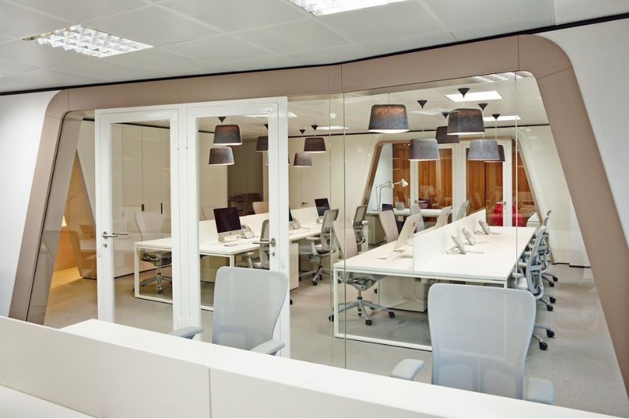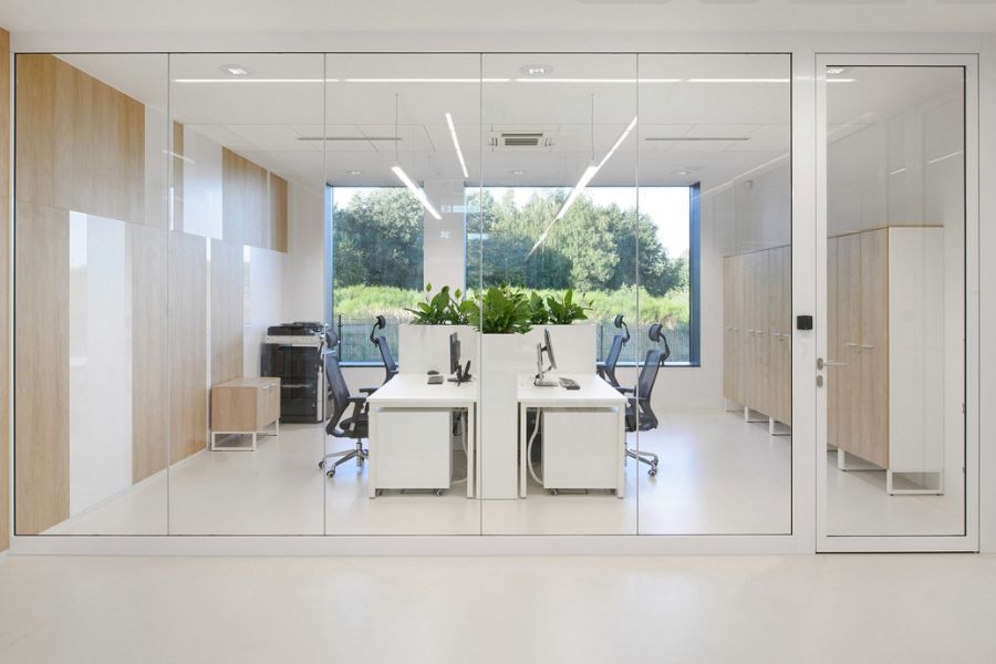 Với những không gian làm việc không có nhiều diện tích, việc sử dụng vách kính được đánh giá cao. Việc ngăn cách giữa các không gian bị xóa mờ khi sử dụng lớp kính trong suốt nhưng sự riêng tư giữa các phòng ban cũng được bảo đảm.