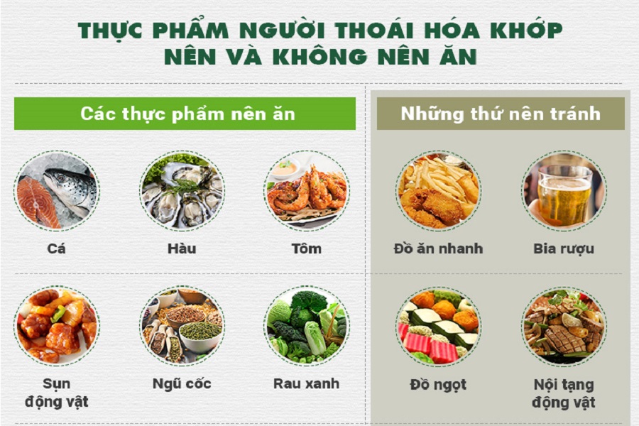 Một bổ sung các loại thực phẩm giàu glucosamine, chondroitin, omega-3, vitamin,…thường có trong cá và nước hầm xương. Hạn chế sử dụng rượu bia, nước có gas, thuốc lá, chất kích thích,… để ngăn ngừa thoái hóa khớp.