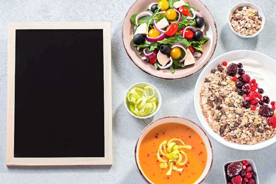 - Chọn thực phẩm cân đối: Đảm bảo rằng bữa ăn của bạn cung cấp đầy đủ chất dinh dưỡng. Bao gồm chất xơ từ các loại: Trái cây, ngũ cốc, rau… protein được bổ sung từ cá, đậu nành, thịt gà… hay chất béo lành từ hạt giống, dầu olive….