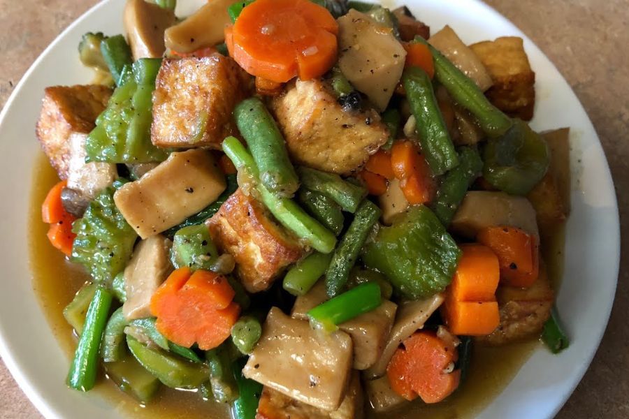 - Bữa trưa: Bò chay xào lúc lắc, cơm, canh chay ngũ sắc.