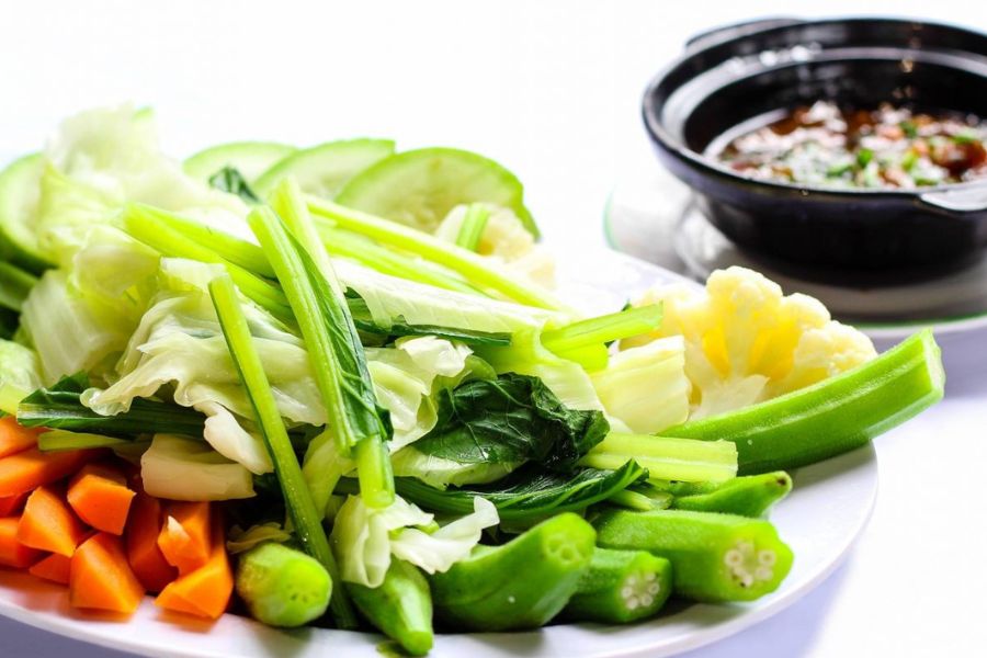 - Canh củ cải hầm chay, canh rau dền đỏ, rau củ luộc,…