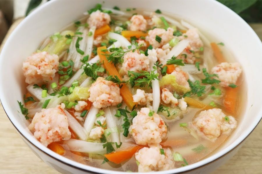 - Buổi tối: Canh chua với tôm và cải thảo.