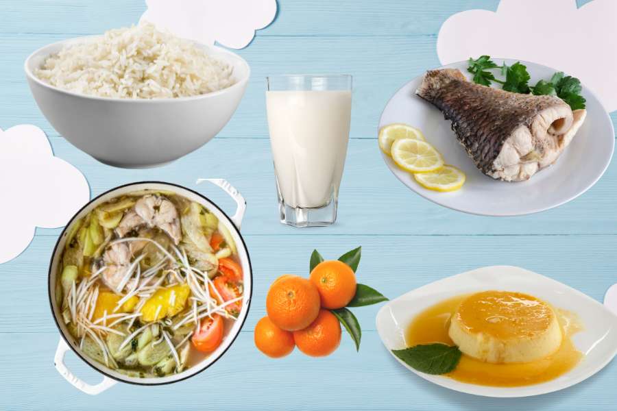 - Bữa trưa: Cơm, cá hấp, canh chua và quýt