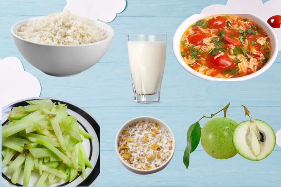 - Bữa trưa: Cơm, canh cà chua nấu trứng, su su xào.