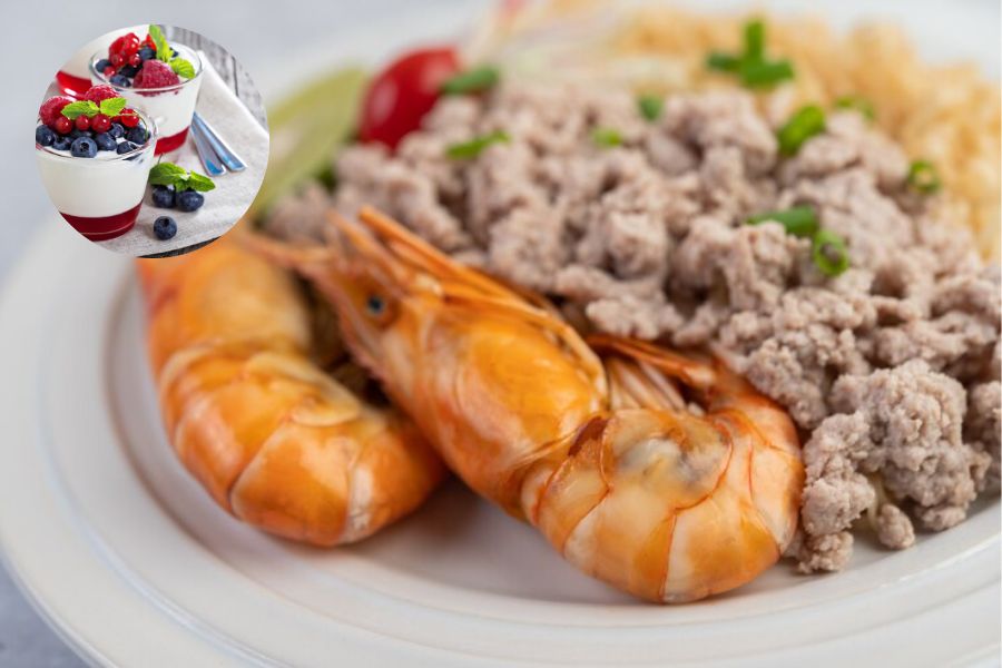 - Bữa sáng (6h30 – 7h30): Yaourt + cháo tôm thịt