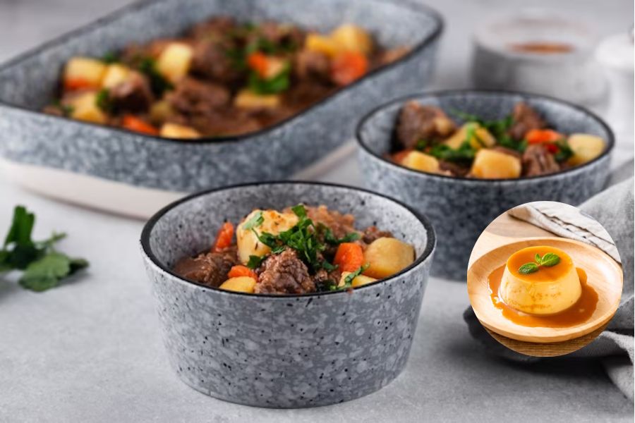 - Bữa trưa (11h00 – 11h30): Bò nấu đậu ăn kèm bánh mì + kem cocktail trái cây