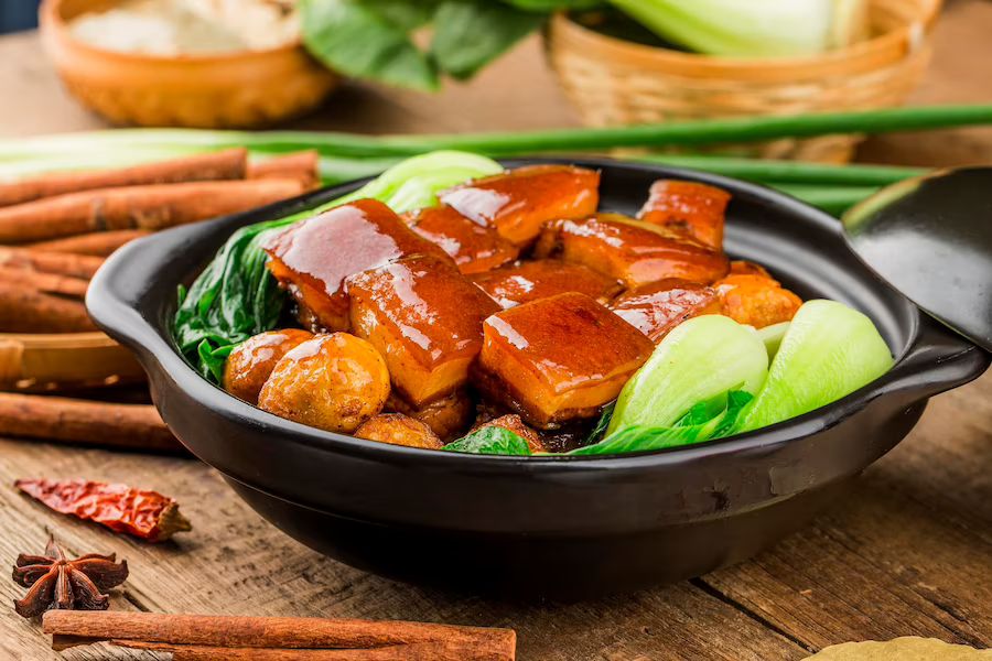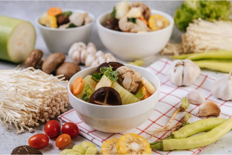 - Trưa: Cơm gà hầm đậu và rau củ.