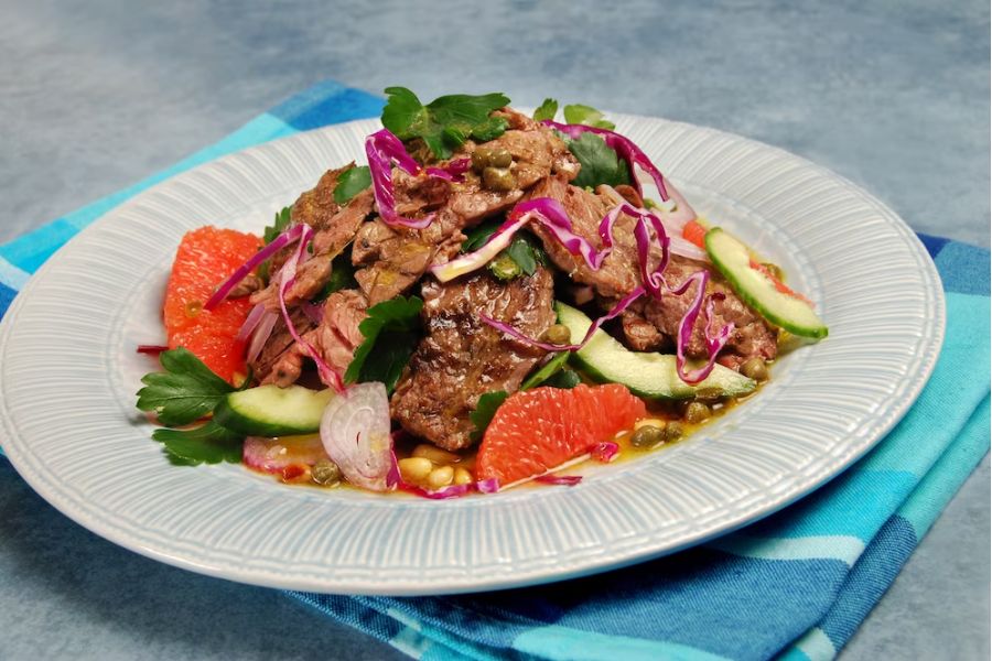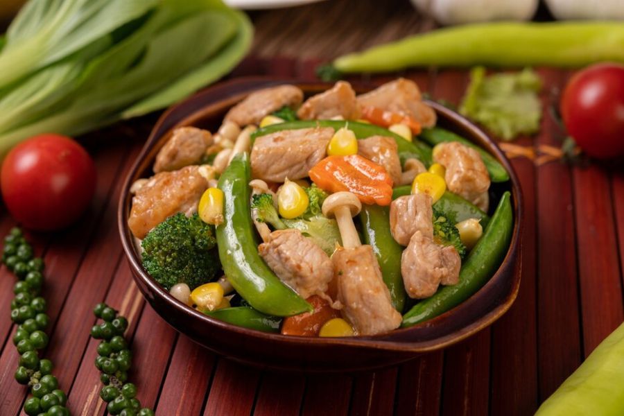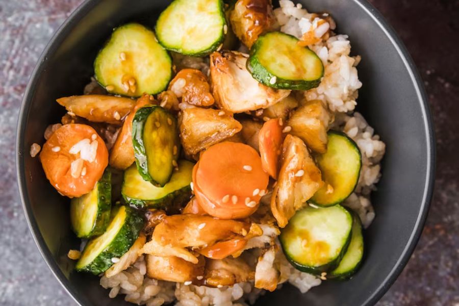 - Tối: Cơm trộn thịt ba chỉ và rau củ.