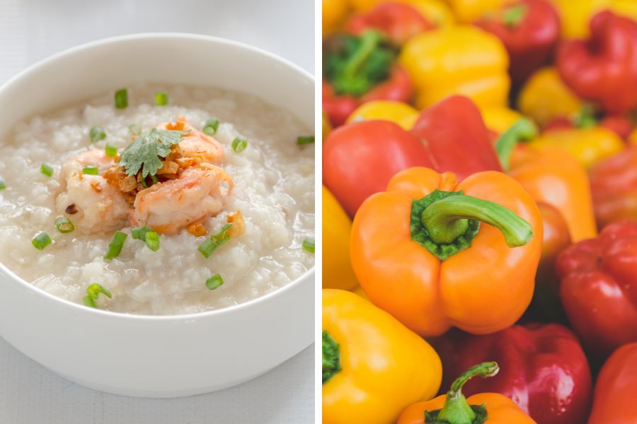 - Bước 5: Cho măng tây và ớt chuông lên trên món cháo vừa ra lò là đã hoàn thành xong món cháo ớt chuông cho bé.