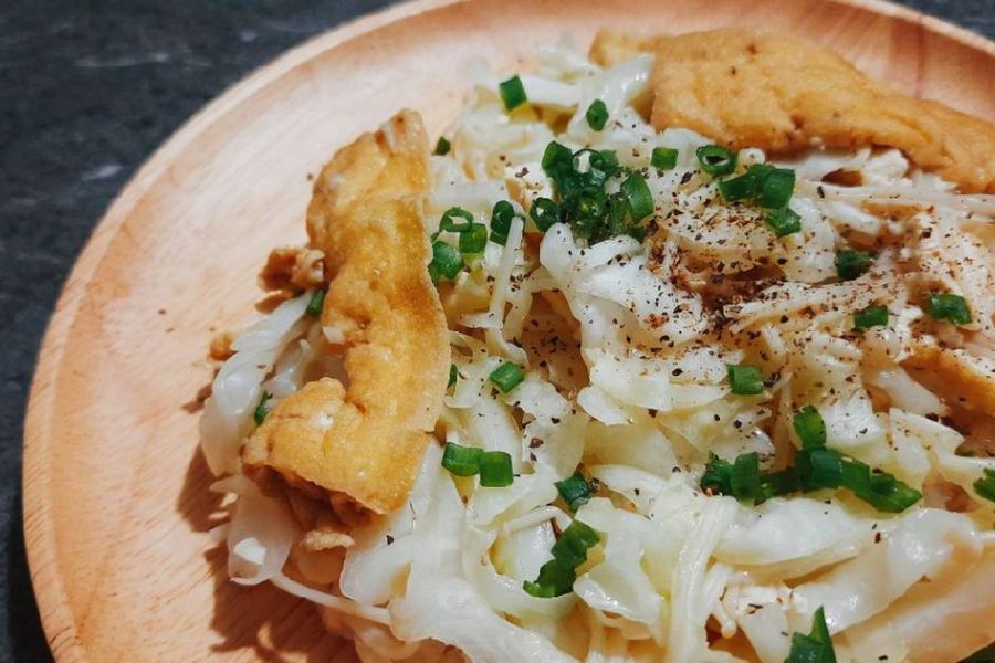 - Bữa sáng: Cơm nát bắp cải trộn đậu phụ chiên giòn.