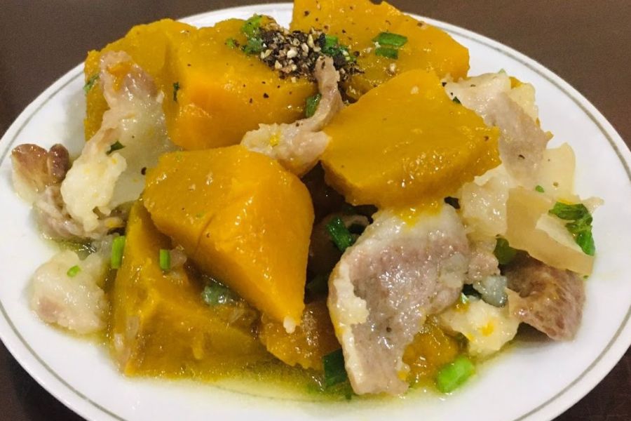 - Bữa tối: Cơm nát thịt ba chỉ kho tàu.