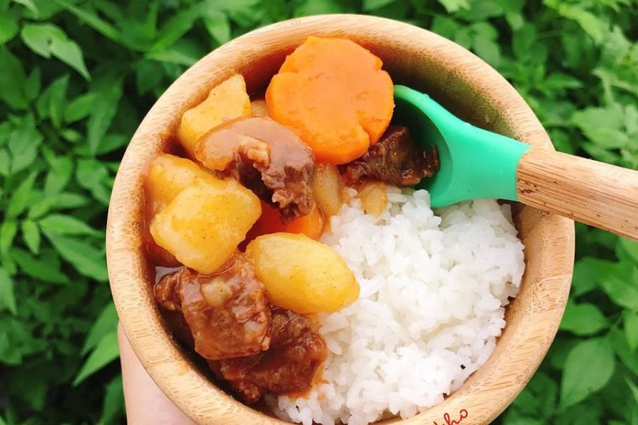 - Bữa trưa: Cơm nát thịt bò hầm khoai tây.