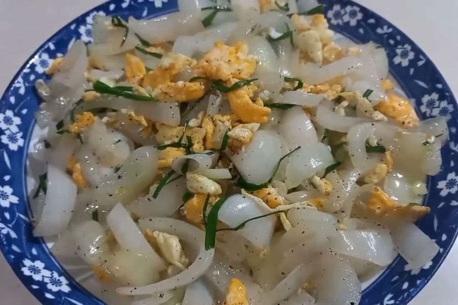 - Bữa sáng: Cơm nát hành tây xào trứng gà.