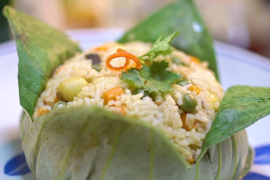 - Sáng: Cơm nát trộn với hạt sen và đậu que luộc.