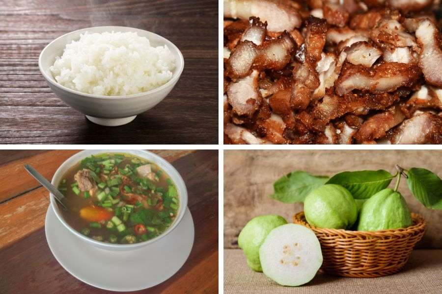 – Thứ 3: Sườn ram, canh xương heo nấu bí đỏ, gỏi rau càng cua trộn thịt bò, ổi
