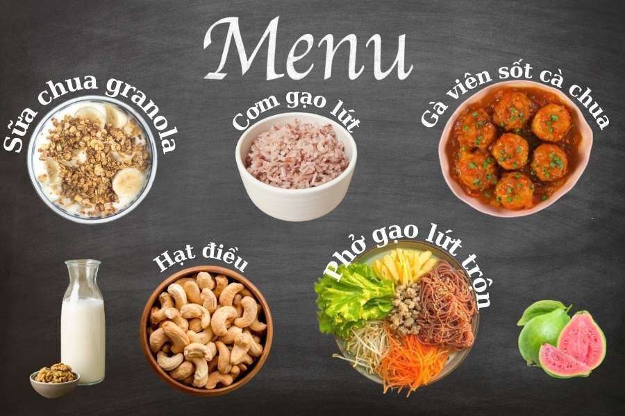 - Bữa sáng: 1 hộp sữa chua không đường, granola, táo, chuối