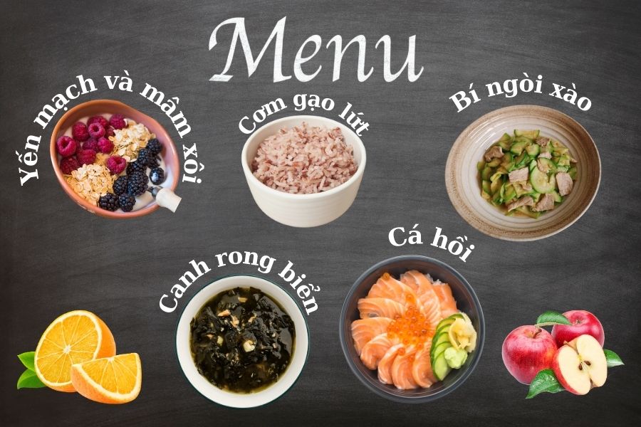 - Bữa tối: 120g cá hồi, salad rong biển