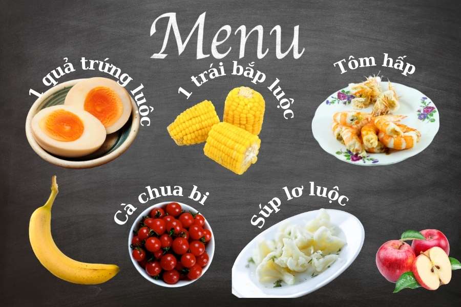 - Bữa sáng: 1 ly sữa, 1 quả trứng, 1 trái bắp nhỏ