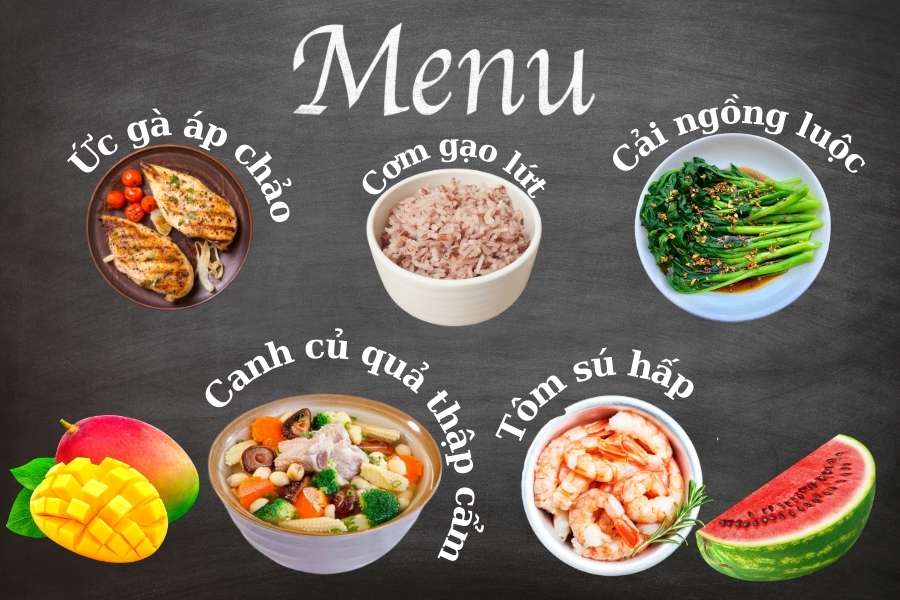 - Bữa tối: 100g tôm sú hấp, 300ml canh củ quả thập cẩm + dưa hấu