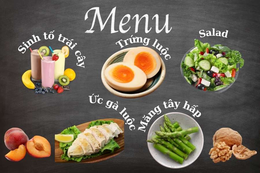 - Bữa tối: 140 gram ức gà luộc, 10 nhánh măng tây hấp