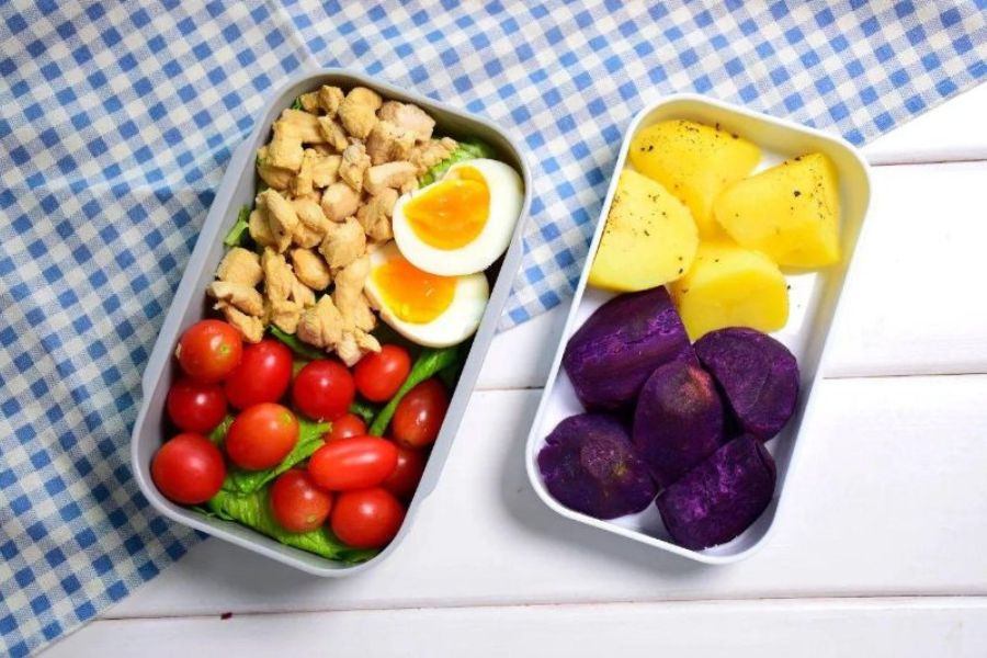 - Bữa sáng: 01 khoai lang, 01 quả trứng gà