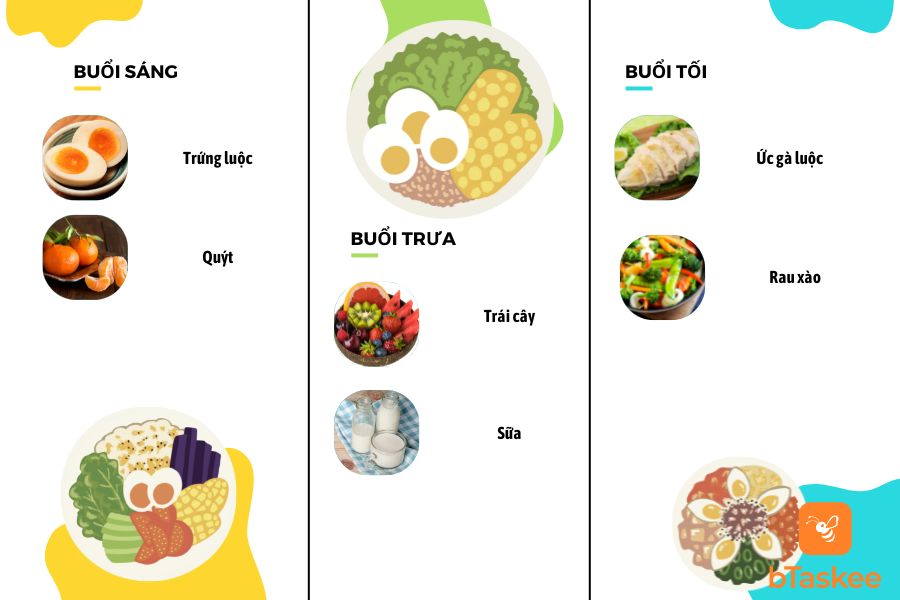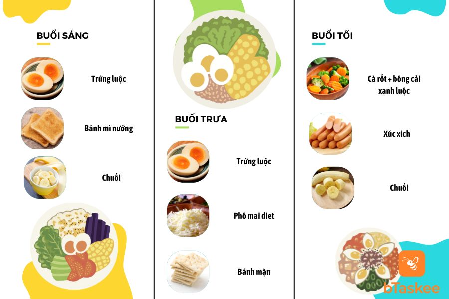 - Bữa sáng: 1 quả trứng luộc, 1 lát bánh mì nướng, 1 quả chuối